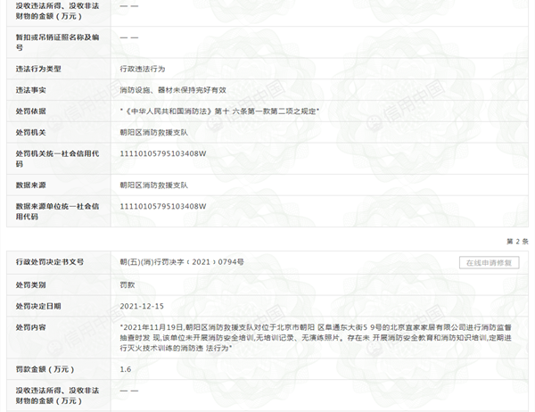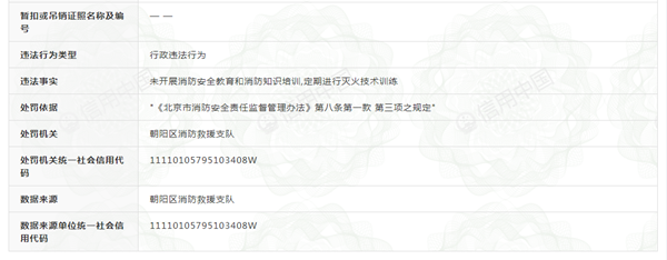 朝(五)(消)行罰決字﹝2021﹞0794號決定書顯示,在上述消防監督抽查時還發現,該單位未開展消防安全培訓,無培訓記錄、無演練照片。存在“未開展消防安全教育和消防知識培訓,定期進行滅火技術訓練”的消防違法行為。依據《北京市消防安全責任監督管理辦法》第八條第一款第三項之規定對其處罰款1.6萬元。